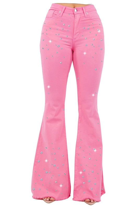 Get ready to dazzle in style with our Vegas Glam Bell Bottom Jeans! Featuring functional pockets, a front button and zipper closure, and hundreds of hand-pressed rhinestones for a diamond-like shine. Proudly made in our LA factory, these jeans are sure to turn heads and make you the center of attention.